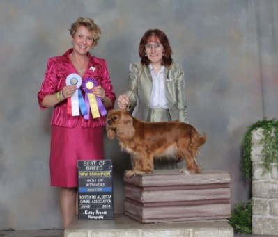 June, 2014- Retiring Champion - Canadian Champion Dawnaquinn Goodnight Vienna retires. Now her biggest concerns are who is going to feed her and who is going to take her for a walk.