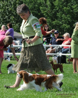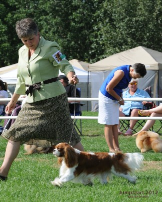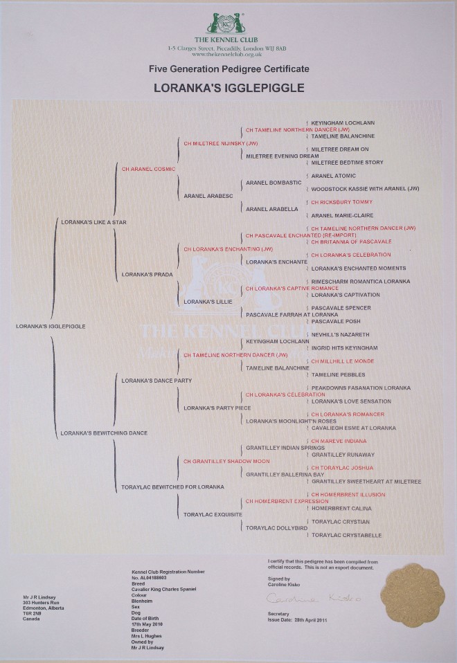 Ziggywas born in Wales by breeder Lorraine Hughes (Loranka Cavaliers) on May 10, 2010. He was purchased and imported into Canada in April 2011. As we were new to show dog competitions we decided to champion Ziggy ourselves. He is such a great dog that novices like us had no problem getting him his champioinship. In 2012, we championed him for 4 months and he finished 5th in the Canadian rankings for his breed for the year. In 2013, we showed him in one show before retiring him to stud and the points he earned from the one show again placed him in the top 10 in the Canadian Cavalier rankings for the year.